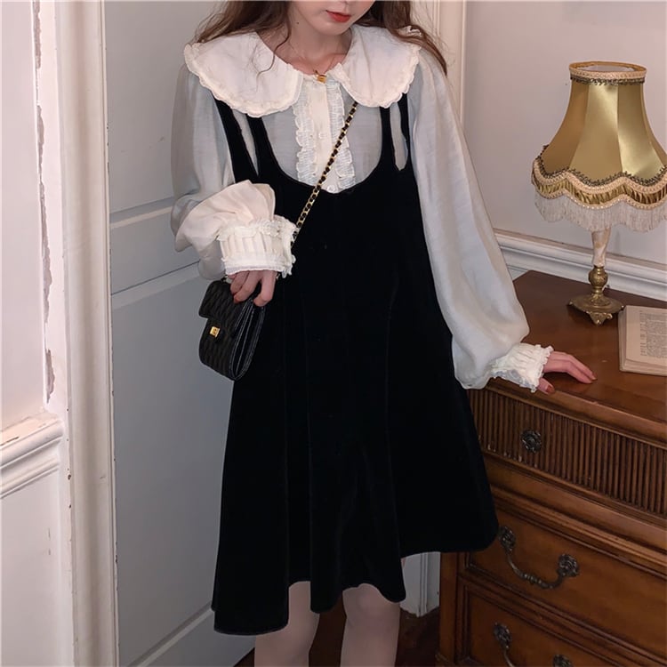 大人可愛いフリルデザインの長袖ブラウスとミニ丈ワンピースのセットです♪
