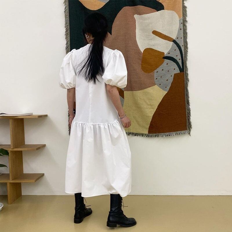 ワンピース 半袖 ミモレ丈 フレア パフスリーブ シンプル 無地 大人カジュアル きれいめ デート お出かけ