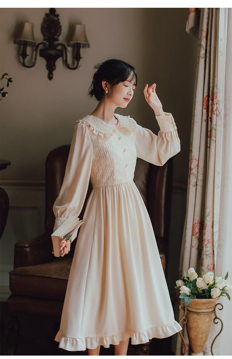 ワンピース 長袖 ミモレ丈 フレア フリル パールボタン きれいめ 上品 大人可愛い デート お出かけ