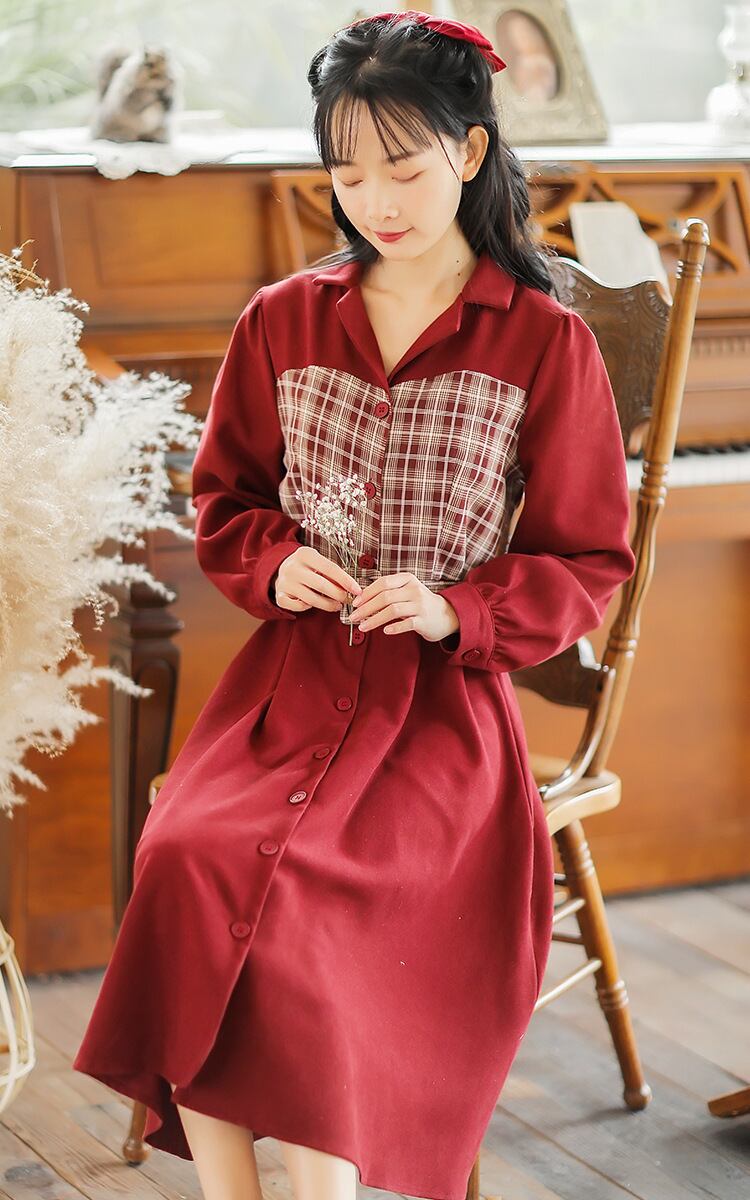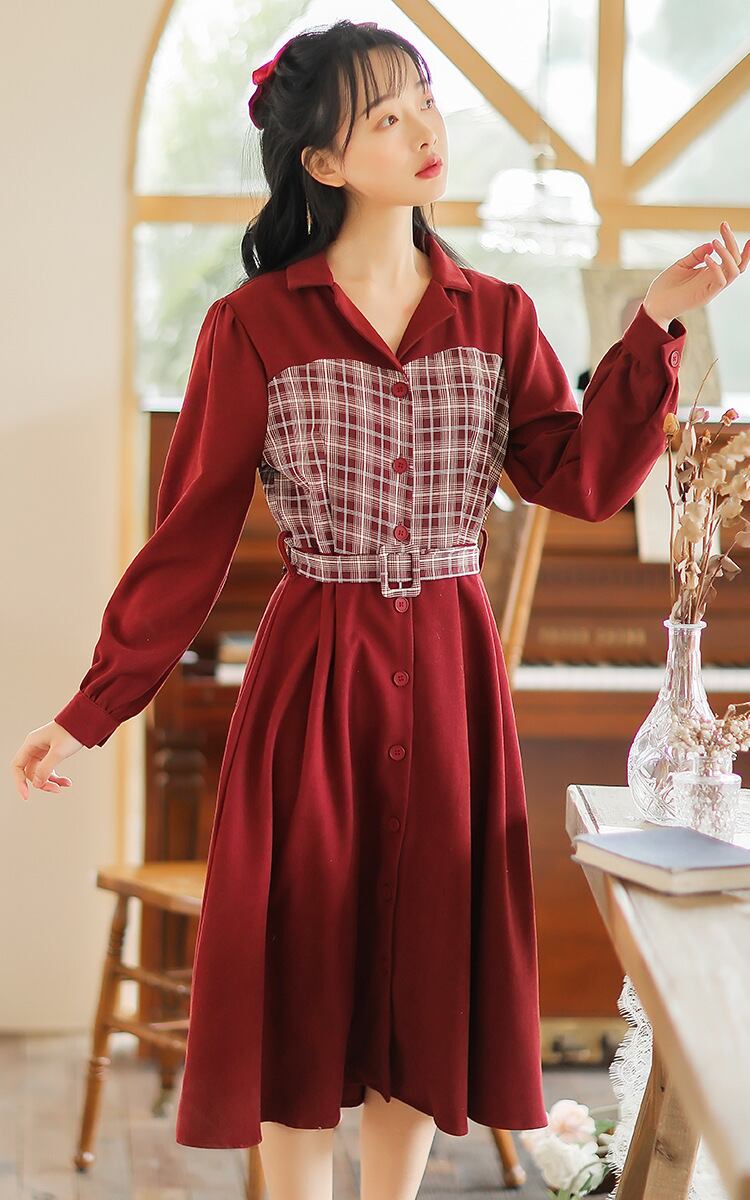 ワンピース 長袖 膝丈 フレア 襟付き チェック柄 フロントボタン ウエストベルト 大人カジュアル