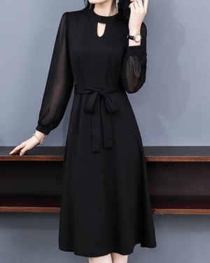 ワンピース 長袖 膝丈 フレア シフォン ウエストリボン シンプル 無地 きれいめ 上品 お出かけ
