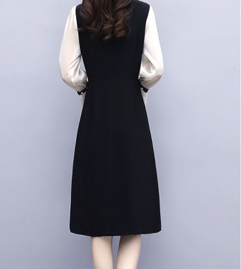 ワンピース 長袖 膝丈 シフォン Vネック モノトーン バイカラー きれいめ 上品 お出かけ きちんと感