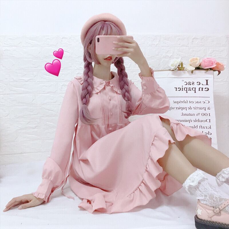 ワンピース 長袖 膝丈 フレア フリル シンプル 無地 大人可愛い デート お出かけ 春