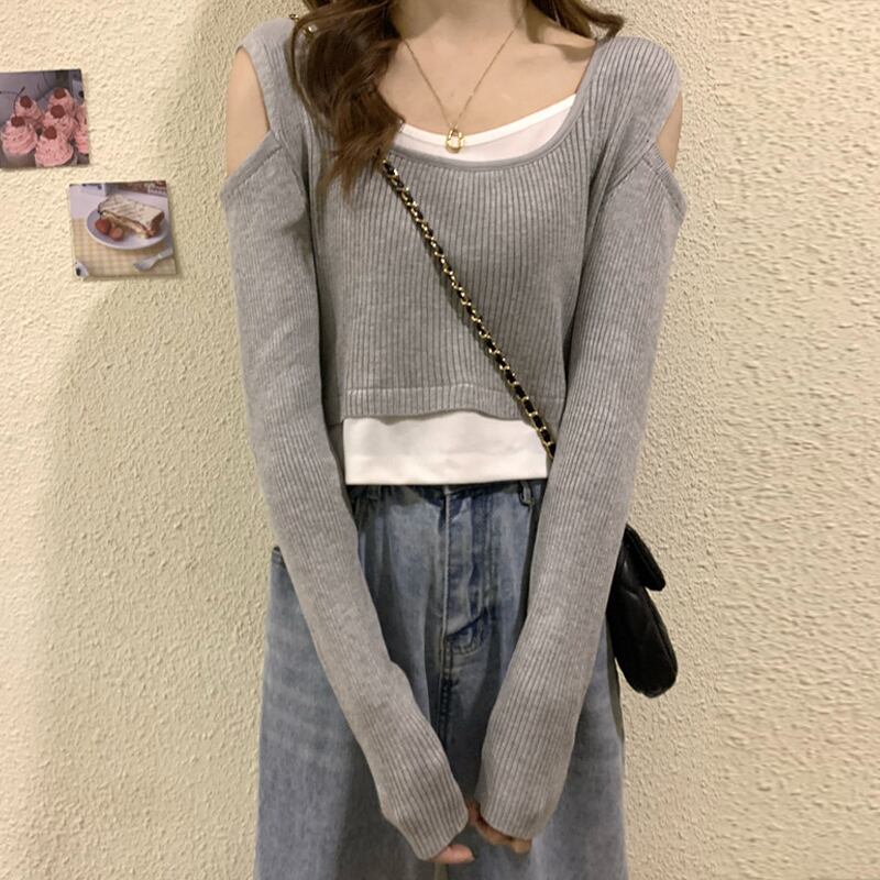 カットソー ニット リブニット 長袖 肩出しデザイン 重ね着風 シンプル カジュアル デート お出かけ