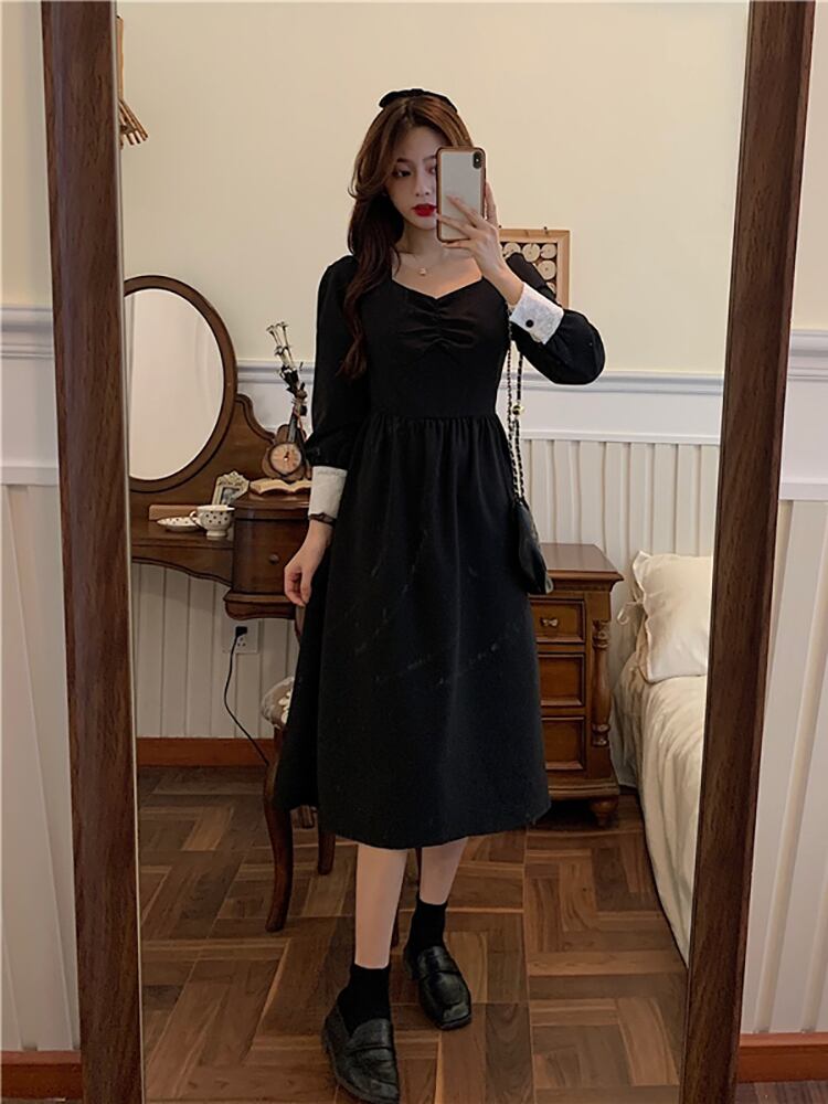 ワンピース 長袖 膝丈 フレア パフスリーブ Vネック レース シンプル 無地 大人可愛い デート