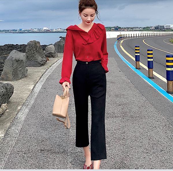 きれいめなフリルデザインの長袖ブラウスとロングパンツのセットアップです♪