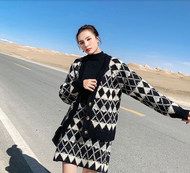 大人カジュアルダイヤ柄デザインのニットカーディガンとスカートのセットです♪