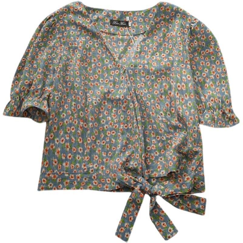 ブラウス 半袖 Vネック ウエストリボン ショート丈 小花柄 大人可愛い レトロ デート お出かけ 春