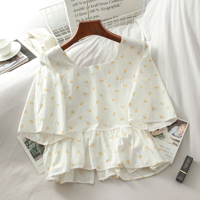 ブラウス 半袖 スクエアネック 小花柄 フレア ショート丈 大人可愛い デート お出かけ 春