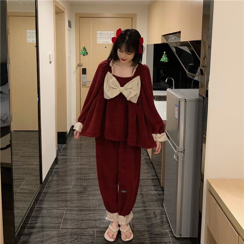 ルームウェア パジャマ セットアップ モコモコ ボア 長袖 ロングパンツ リボン 大人可愛い