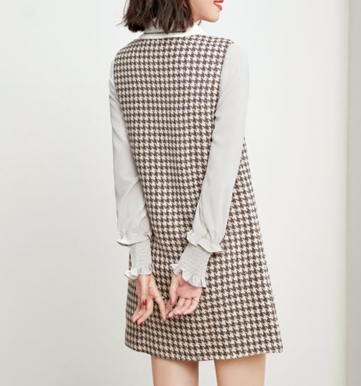 ワンピース 長袖 ミニ丈 重ね着風 チェック柄 襟付き リボン 大人カジュアル トラッド デート