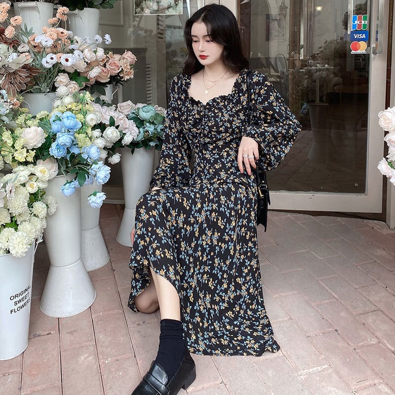 ワンピース 長袖 ミモレ丈 フレア 小花柄 大人可愛い シック デート お出かけ 春