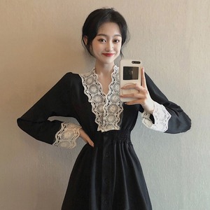ワンピース 長袖 ミモレ丈 レース シンプル 無地 大人可愛い レトロ デート お出かけ 春