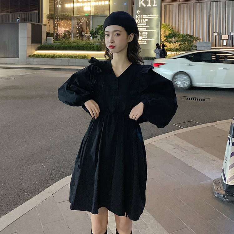 ワンピース 長袖 ミニ丈 フレア フリル コットン ウエストギャザー シンプル 無地 大人可愛い 春