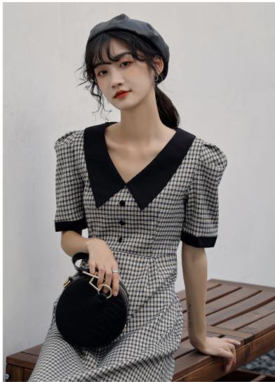 ワンピース 半袖 膝丈 襟付き くびれデザイン チェック柄 大人カジュアル デート お出かけ 春