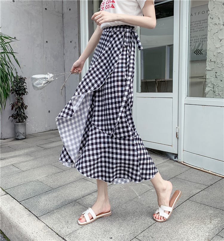 スカート ラップスカート ミモレ丈 ウエストリボン フレア ギンガムチェック 大人カジュアル 春