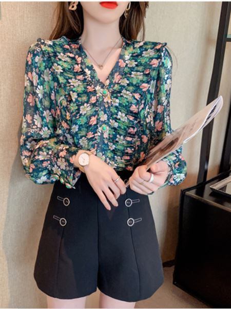 ブラウス シフォンブラウス 長袖 フリル 小花柄 大人可愛い Vネック デート お出かけ 春