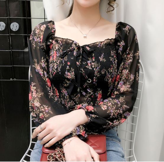 ブラウス シフォンブラウス 長袖 小花柄 オフショルダー レースアップ フリル 大人可愛い 春