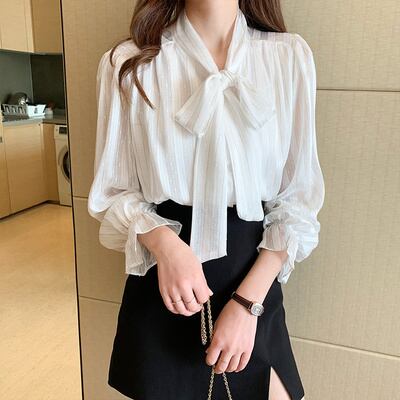 ブラウス 長袖 ストライプ キャンデイースリーブ ボウタイリボン きれいめ 大人可愛い お出かけ