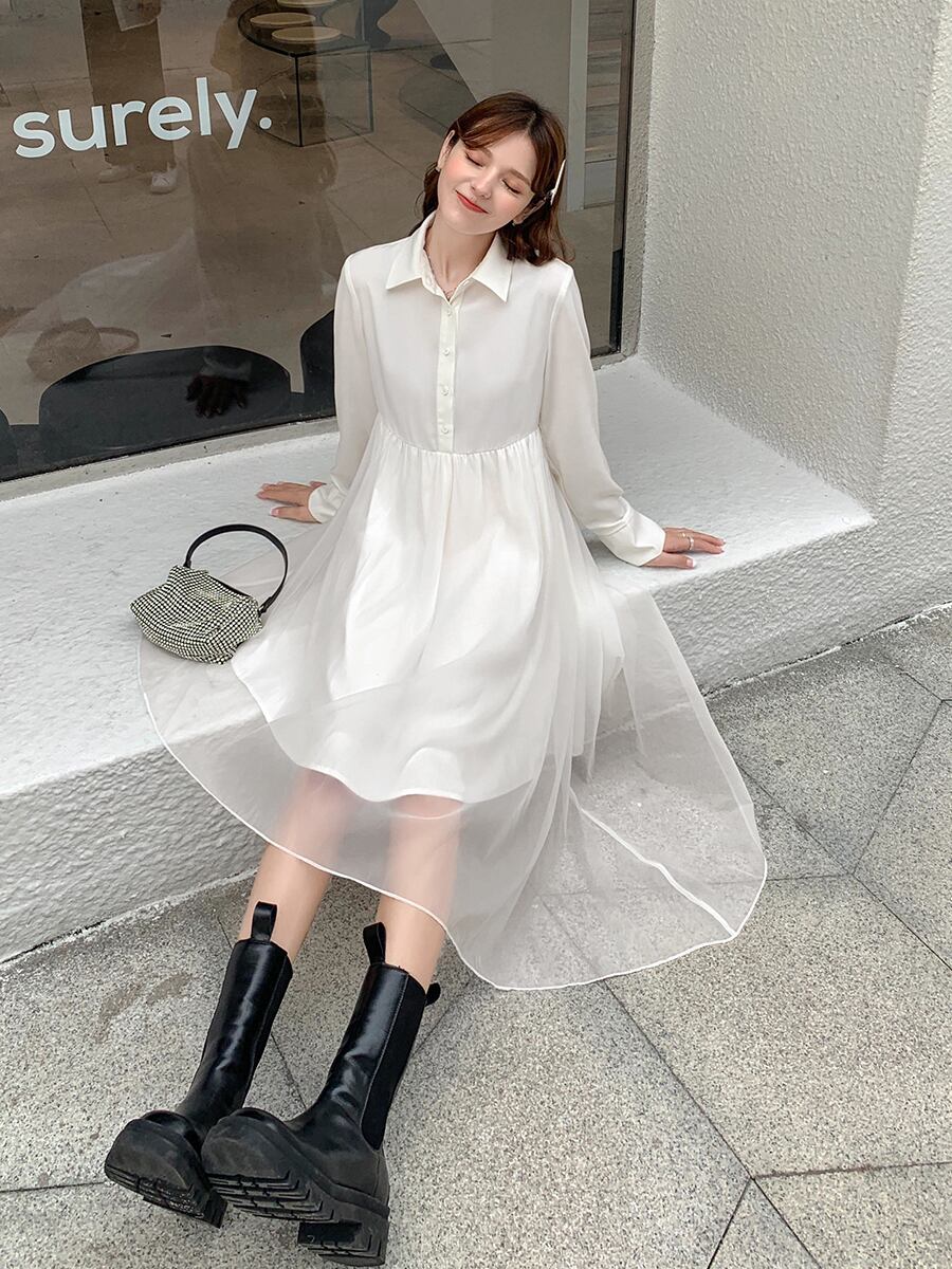 ワンピース シャツワンピース 長袖 膝丈 アシンメトリー フレア シンプル 無地 きれいめ デート