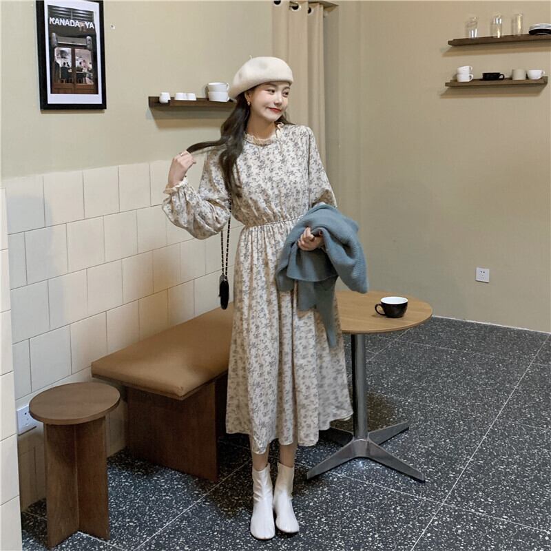 ワンピース シフォンワンピース 長袖 ミモレ丈 フレア 小花柄 大人可愛い デート お出かけ