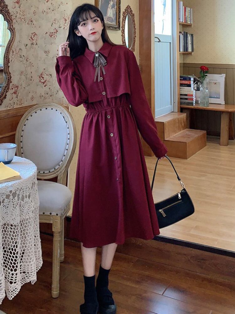 ワンピース 長袖 ミモレ丈 フレア 襟付き フロントボタン シンプル 大人カジュアル お出かけ