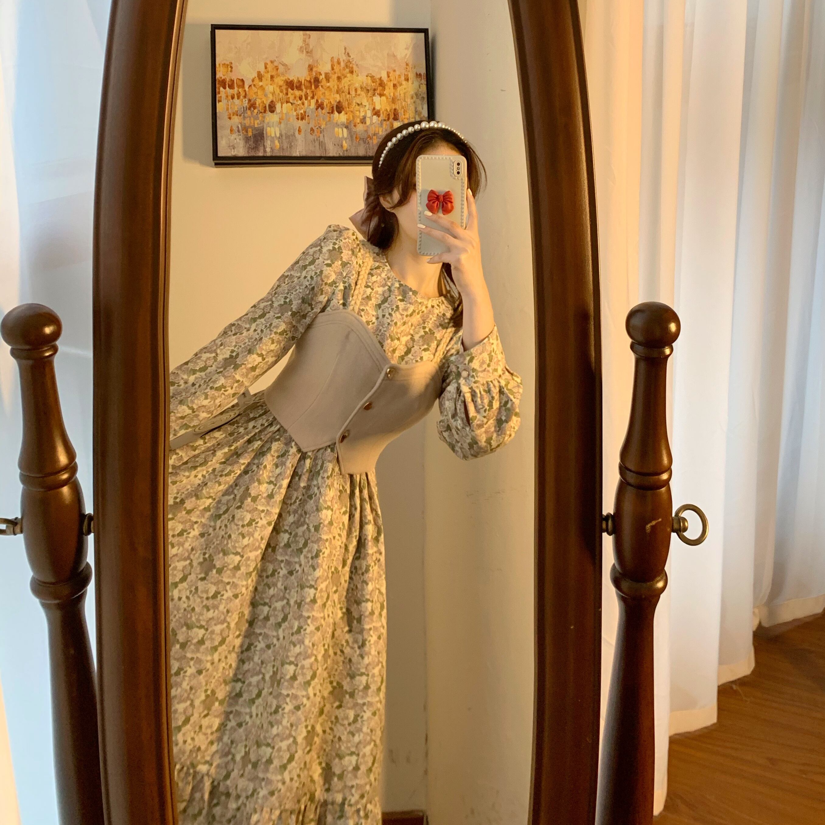 セットアップ ツーピース ワンピース 長袖 ロング丈 小花柄 ビスチェ 大人可愛い デート 春