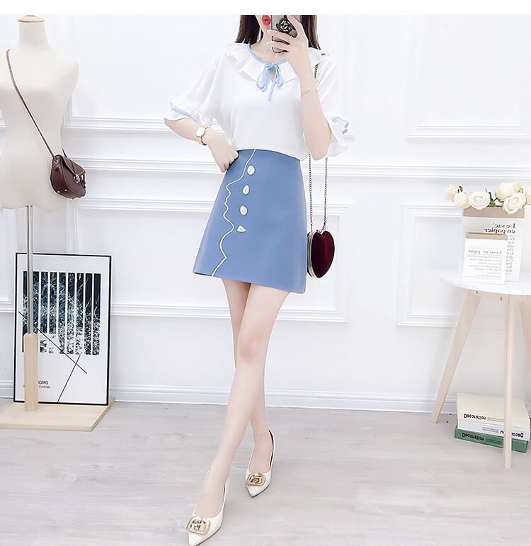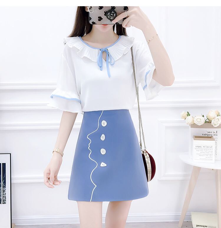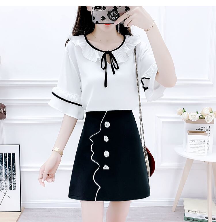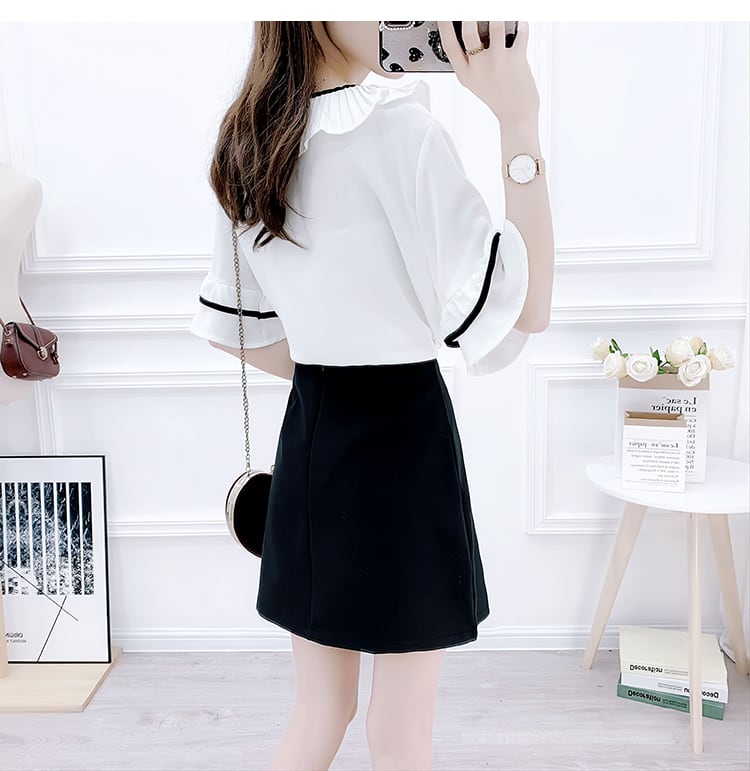 きれいめなフリルデザインの半袖ブラウスとミニ丈スカートのセットです♪
