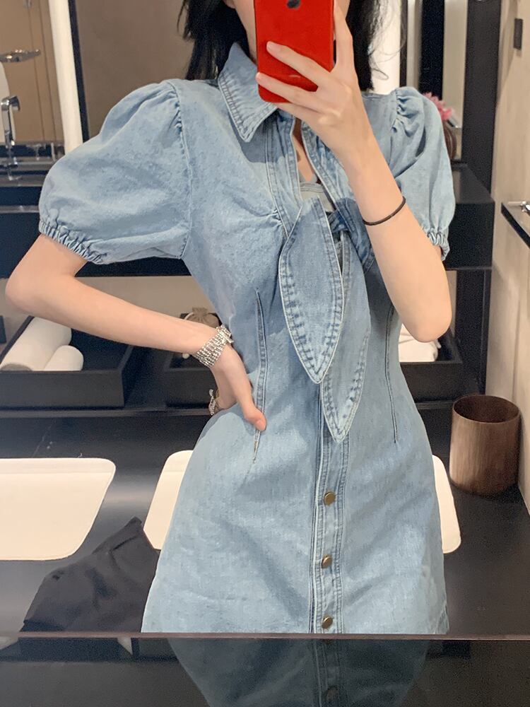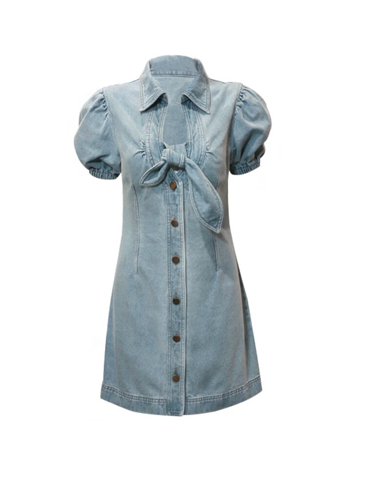 ワンピース デニム ミニ ショート 細身 夏 半袖 ブルー リボン
