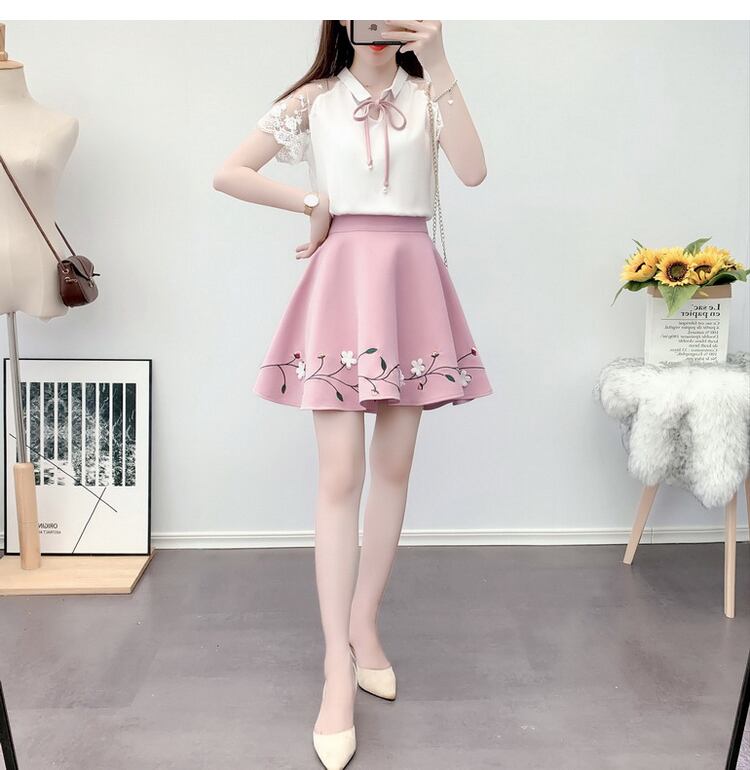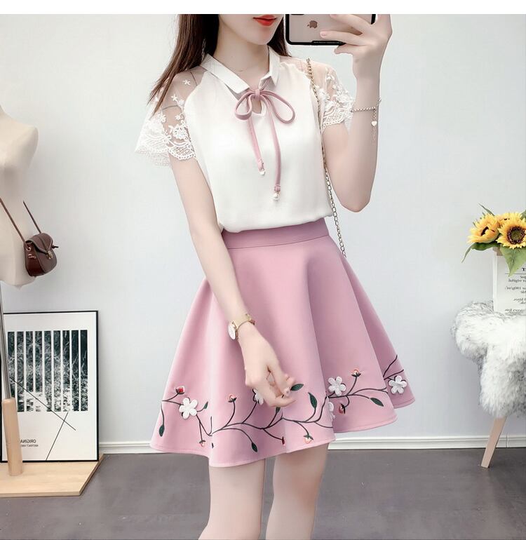 大人可愛いレースデザインの半袖ブラウスとミニ丈スカートのセットです♪