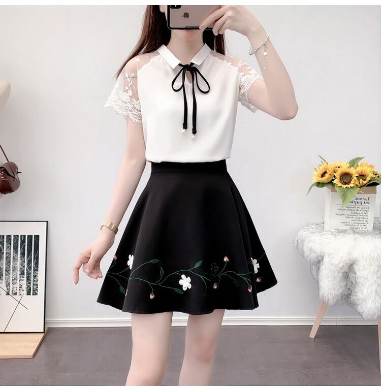 セットアップ ツーピース 半袖 ブラウス レース シースルー スカート ミニ丈 フレア 刺繍 デート
