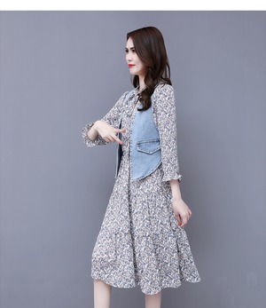 セットアップ ツーピース ワンピース シフォンワンピース 7分袖 ひざ丈 フレア 小花柄 ベスト デニムベスト
