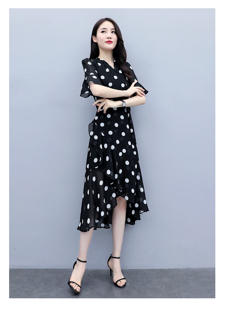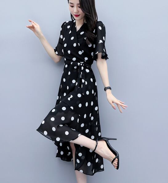 ワンピース シフォンワンピース 半袖 ミモレ丈 フレア ドット柄 水玉 きれいめ 大人可愛い デート