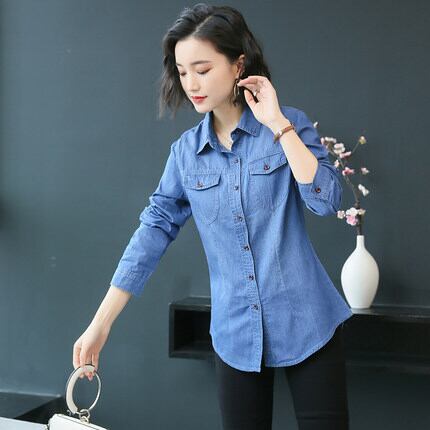 トップス デニム シャツ カジュアル 長袖 春 秋 ブルー ライト ブルー 大きい