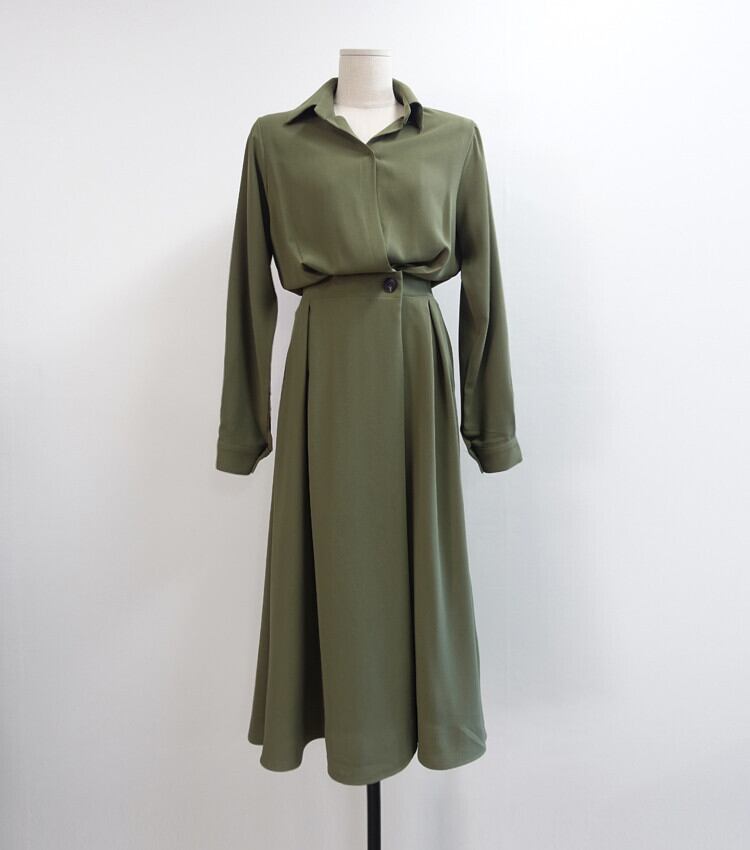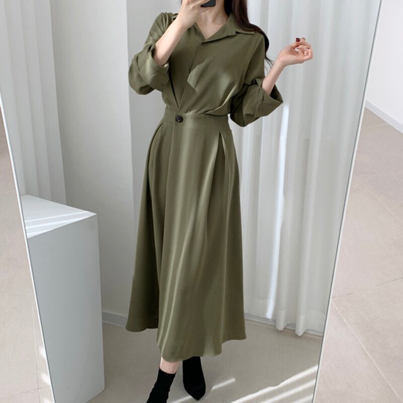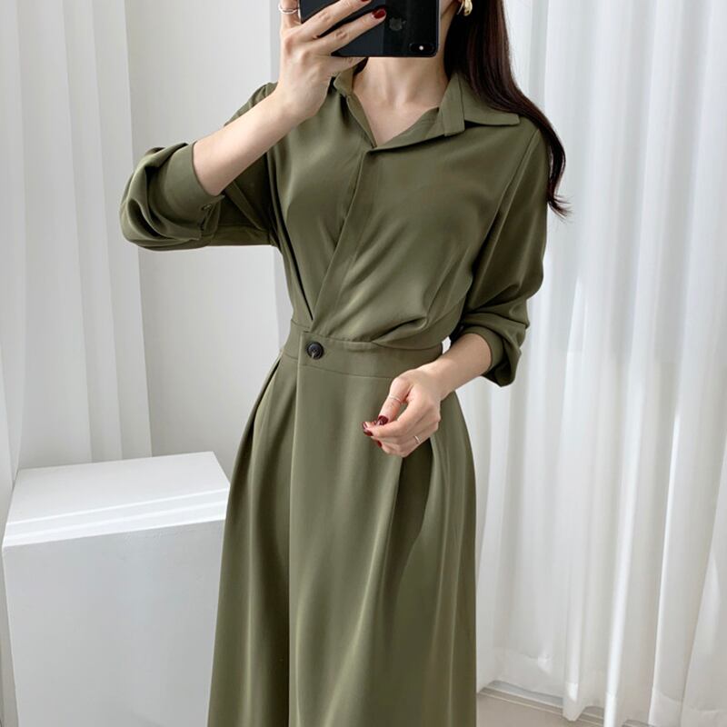 ワンピース シャツワンピース 長袖 ミモレ丈 フレア くびれデザイン シンプル 無地 大人カジュアル