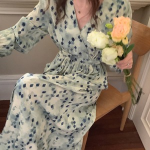 ワンピースシフォンワンピース 長袖 ロング丈 フレア Vネック ウエストギャザー きれいめ 上品