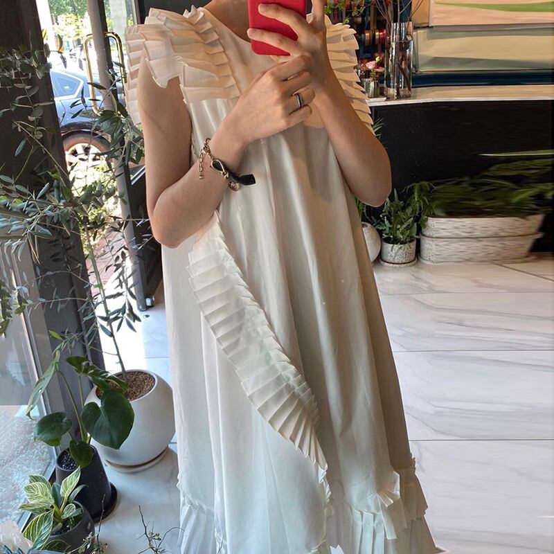 ワンピース ノースリーブ ミモレ丈 フリル フレア シンプル 無地 きれいめ 大人可愛い デート