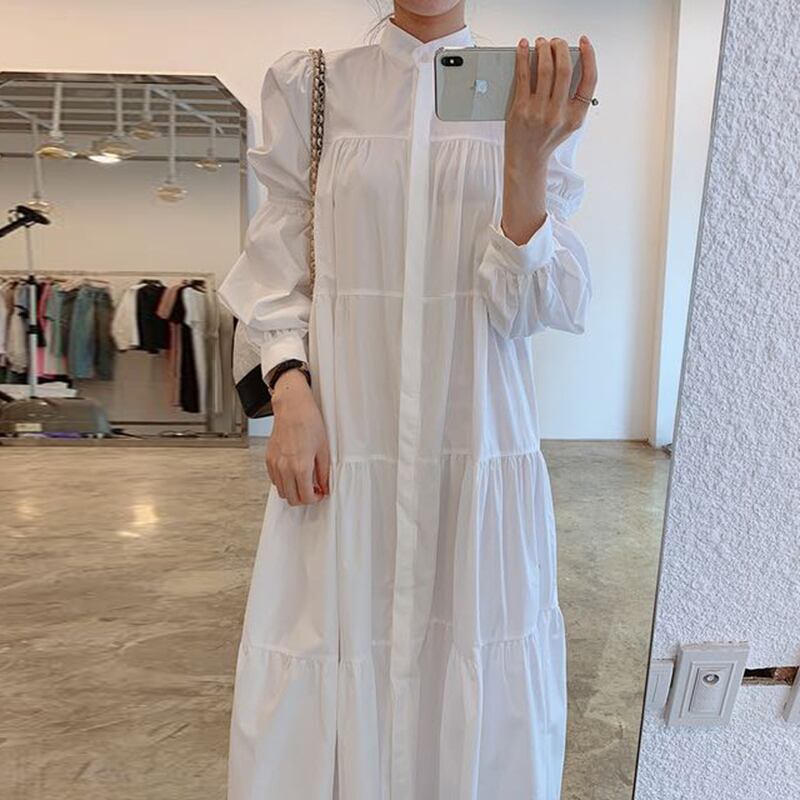 ワンピース シャツワンピース バンドカラー 長袖 ミモレ丈 フレア シンプル 無地 大人カジュアル