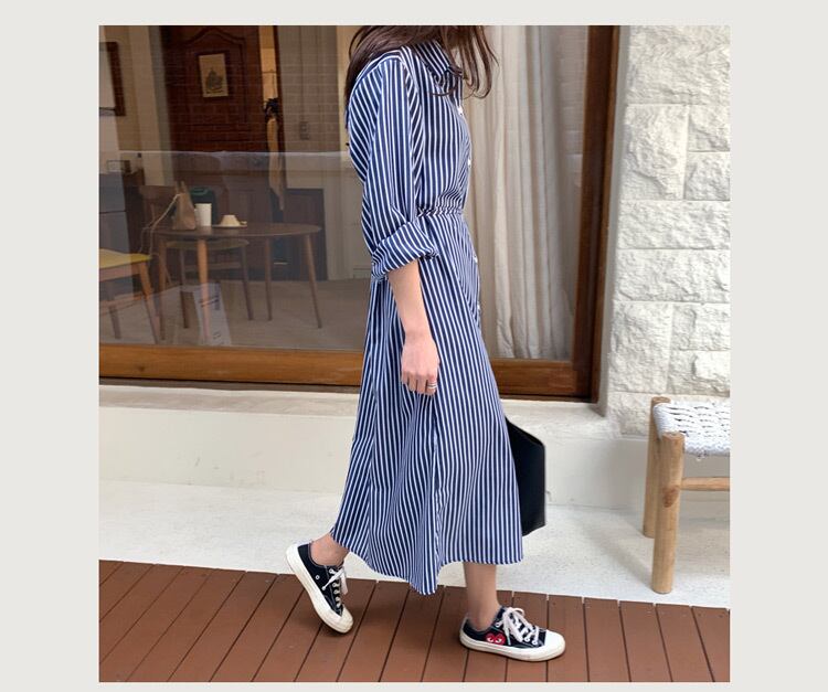 ワンピース シャツワンピース 長袖 ミモレ丈 ストライプ 大人カジュアル デート お出かけ 春