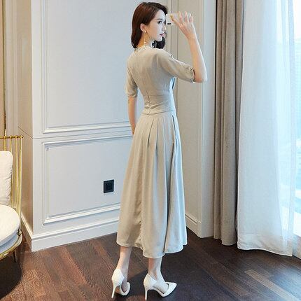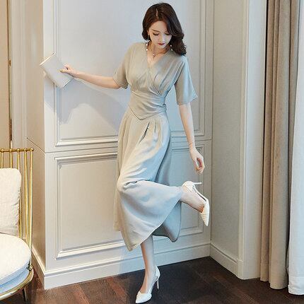 ワンピース タイト 細身 半袖 ロング ワンカラー グレー Vネック マーメイド 大人