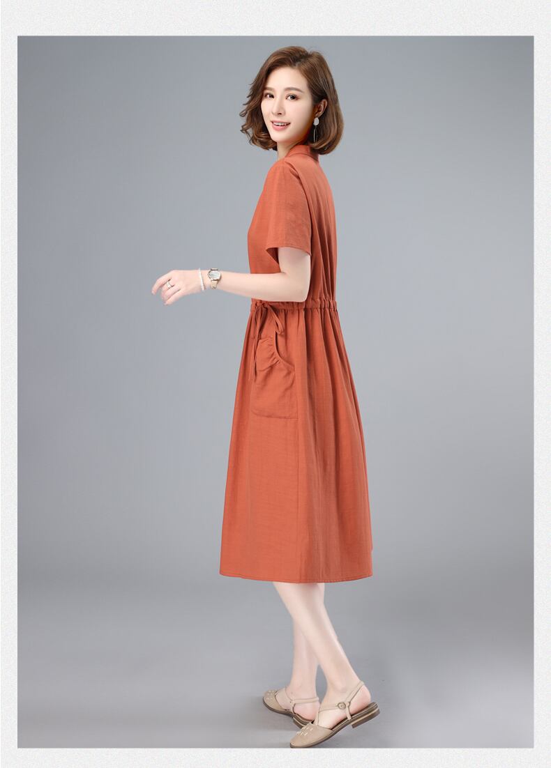 ワンピース 半袖 膝丈 フレア Vネック ウエストリボン 麻 シンプル 無地 大人カジュアル お出かけ 夏