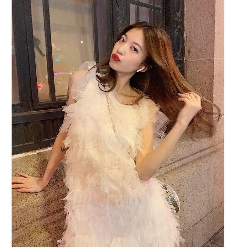 ワンピース ドレス ノースリーブ ミニ丈 フェザー チュール 大人可愛い きれいめ デート お呼ばれ