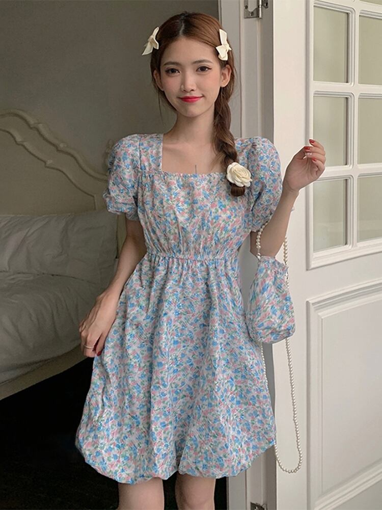 ワンピース 半袖 ミニ丈 パフスリーブ 小花柄 スクエアネック 大人可愛い デート お出かけ 夏