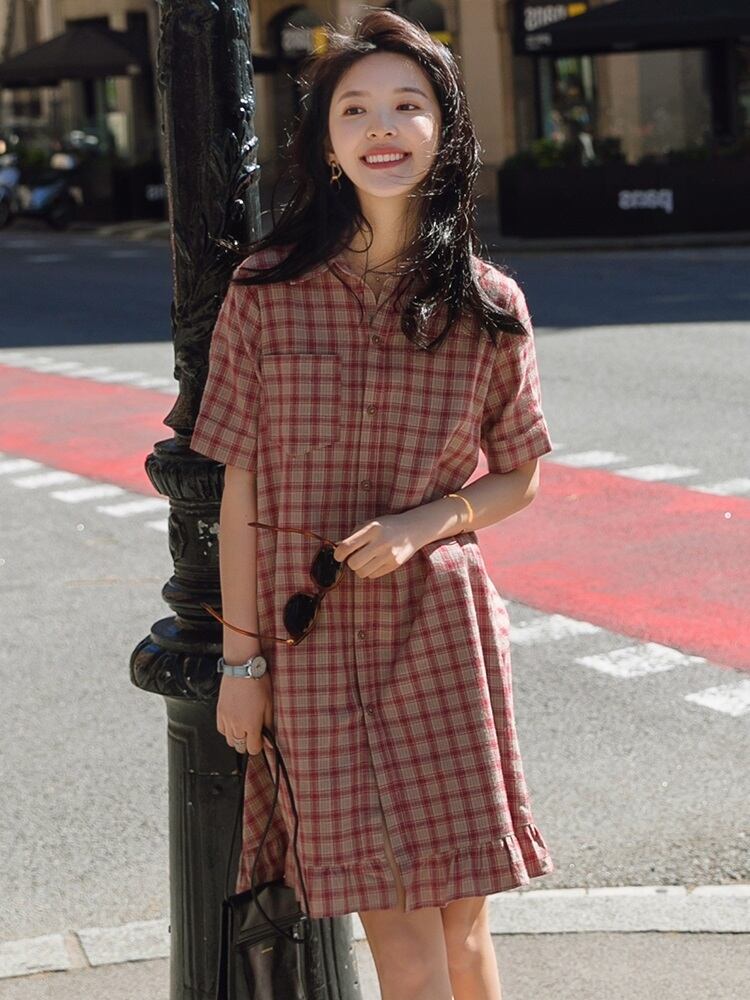 ワンピース シャツワンピース 半袖 膝丈 フレア チェック柄 大人カジュアル デート お出かけ