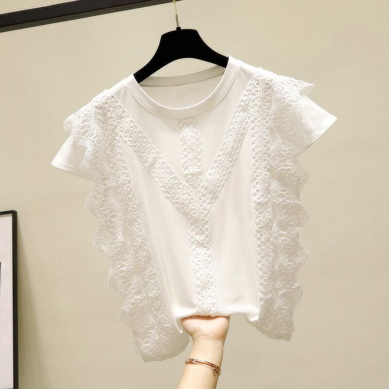 ブラウス カットソー 半袖 レース シンプル 無地 大人可愛い きれいめ デート お出かけ 夏