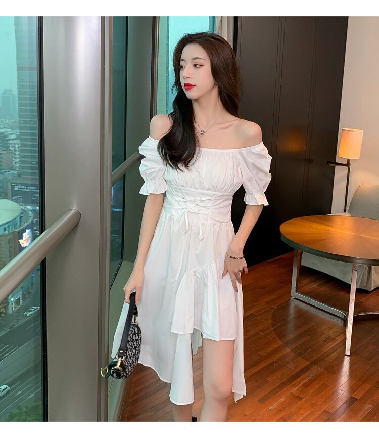 ワンピース 半袖 膝丈 フレア アシンメトリー パフスリーブ くびれデザイン 大人可愛い デート 夏
