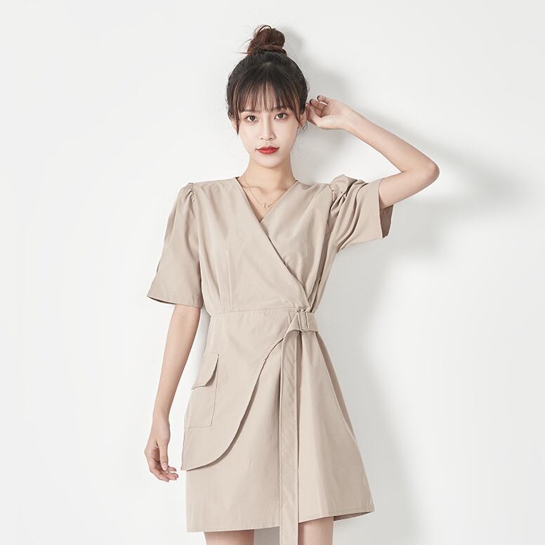ワンピース 半袖 ミニ丈 Vネック ウエストベルト シンプル 無地 大人カジュアル デート お出かけ 夏