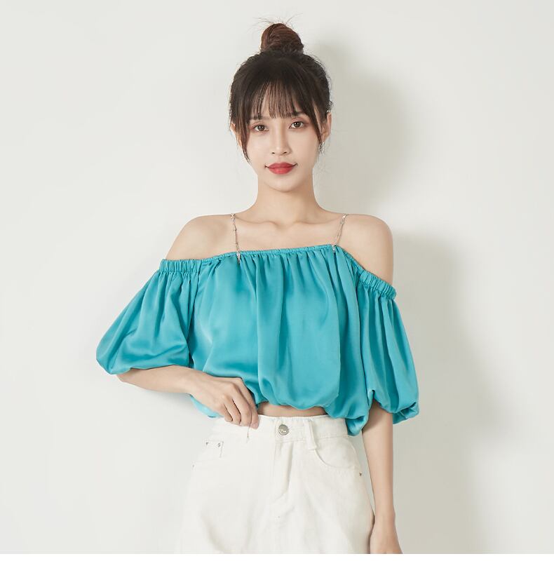 ブラウス カットソー 半袖 シフォン オフショルダー チェーンストラップ シンプル 無地 大人かわい