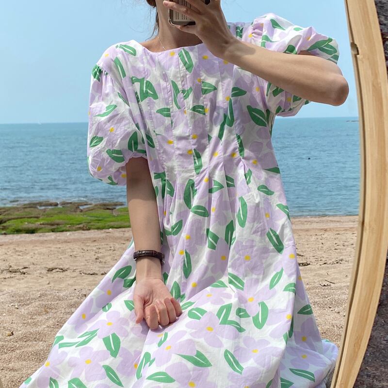 ワンピース 半袖 ロング丈 フレア 花柄 大人可愛い ゆったり ビーチ リゾート デート お出かけ