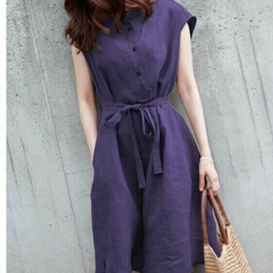 ワンピース 半袖 ひざ丈 フレア 麻 ウエストリボン シンプル 無地 きれいめ 大人カジュアル 夏